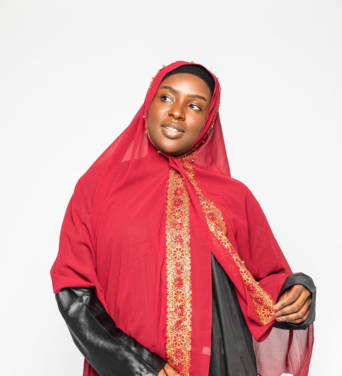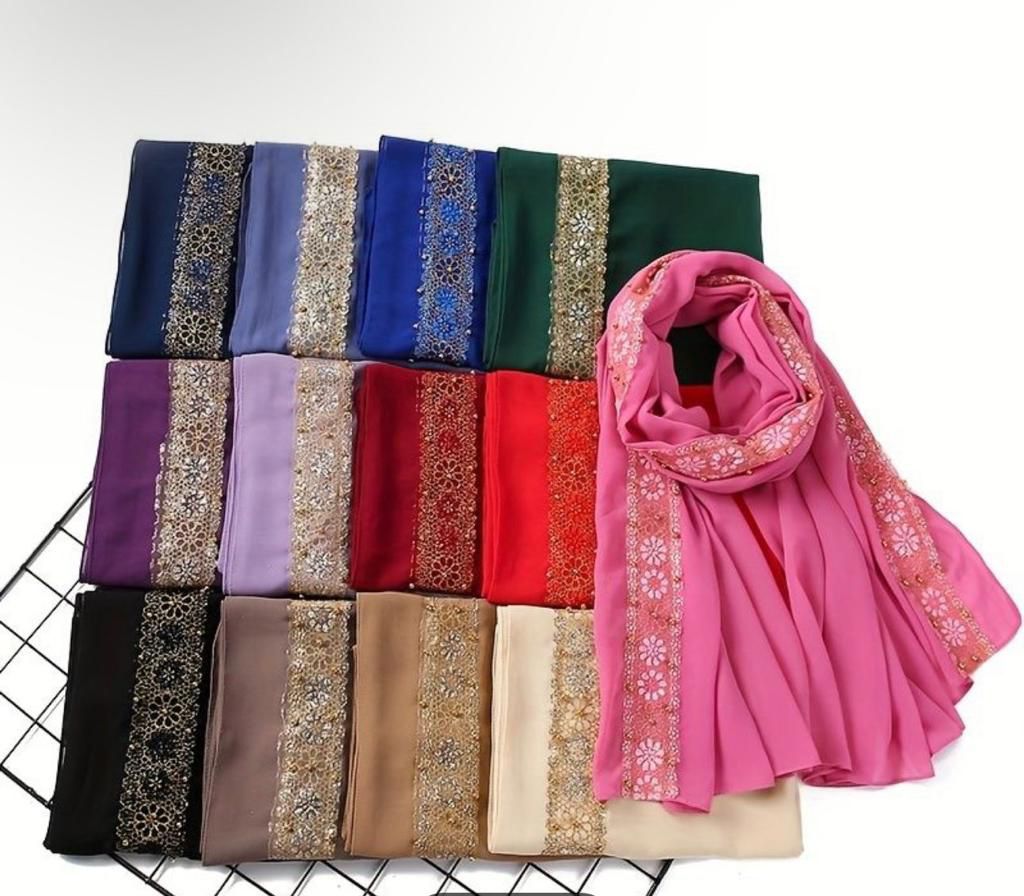 AVAILABLE COLORS: AVAILABLE Size : One size fits all One size fits all One size fits all One size fits all One size fits all One size fits all One size fits allElevate your wardrobe with the Regal Bloom Chiffon Hijab, a perfect blend of elegance and sophistication. Crafted from premium chiffon, this hijab features an intricate floral lace border adorned with delicate gold accents, adding a touch of luxury to any outfit. Available in a stunning range of vibrant and neutral colors, it’s lightweight, breathable, and designed for all-day comfort. Whether for a special occasion or daily wear, this hijab ensures you radiate grace and style effortlessly.